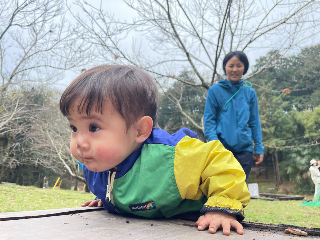 Aちゃんは思うようにいかず泣き出して母の元へ