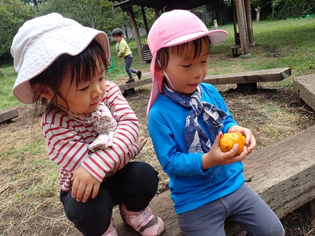 N君がAちゃんに柿を渡す。