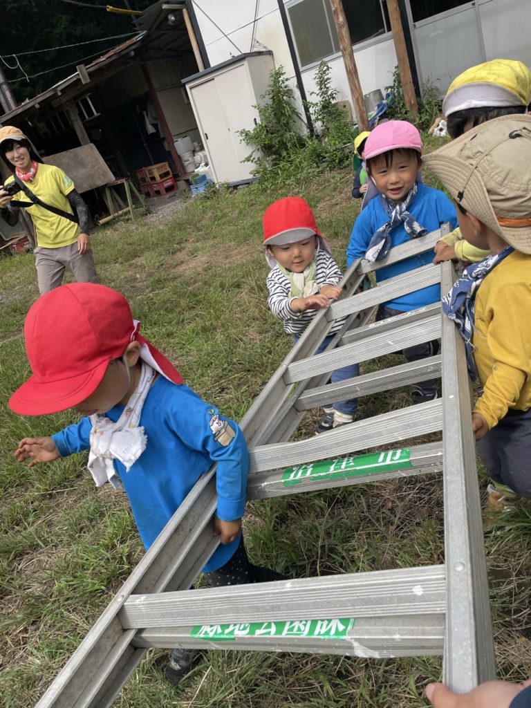 重いはしごを力を合わせて運ぶ。