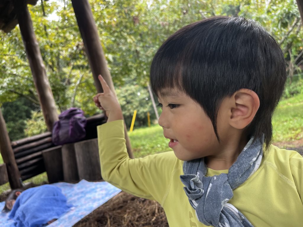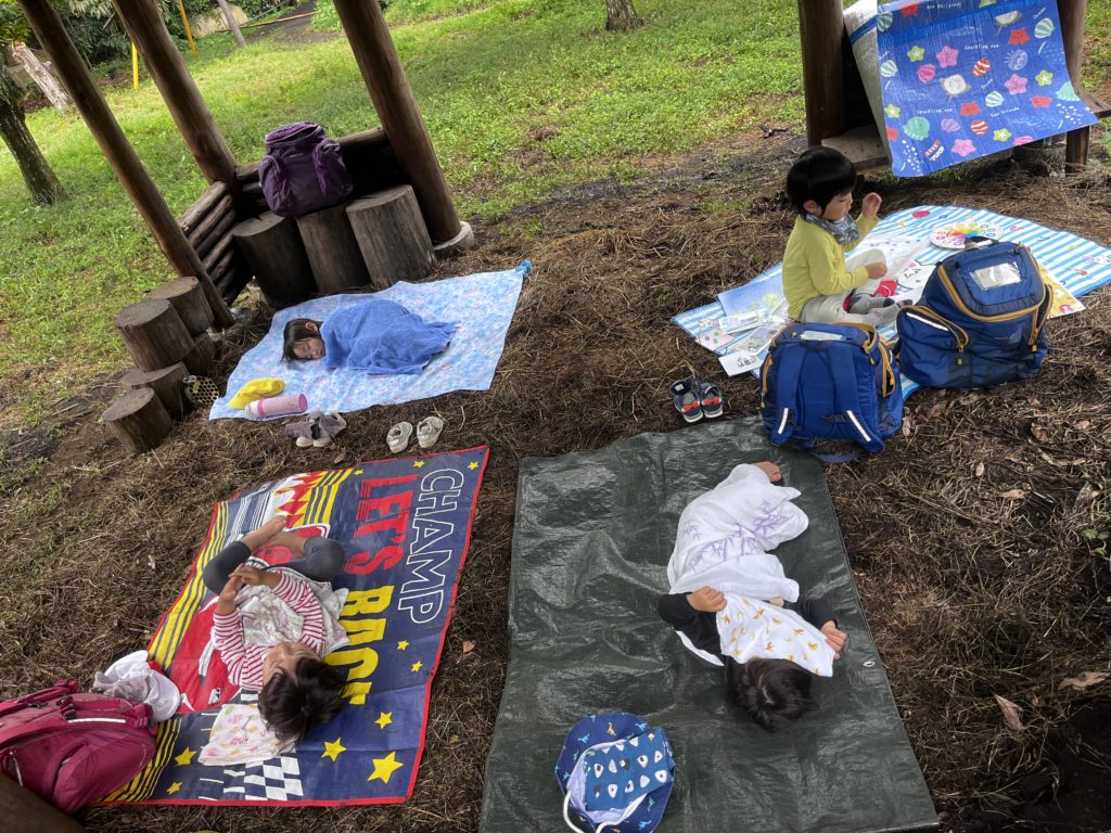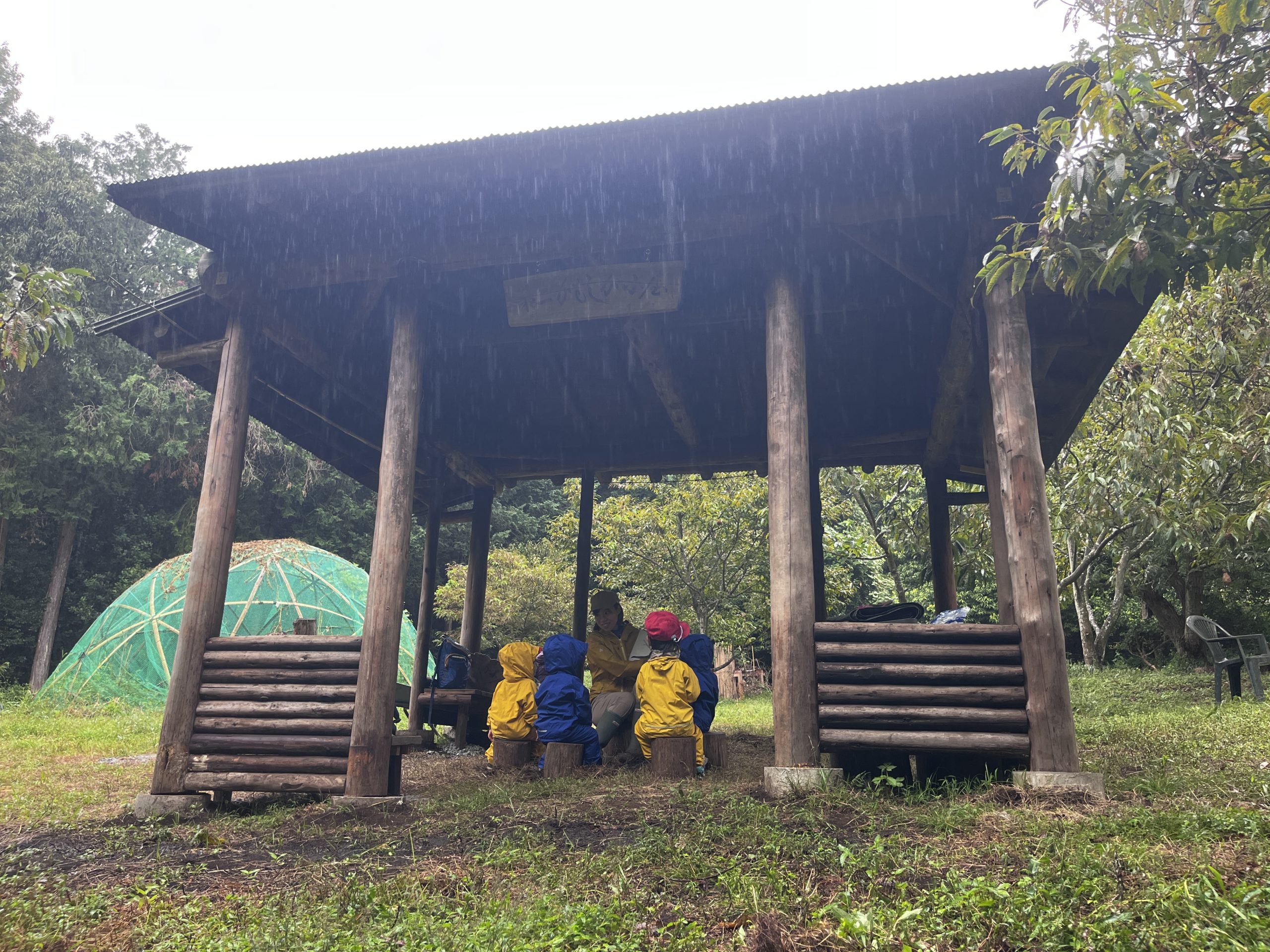 唯一起きていたSくんは、食後になって突然あずまやの外を指さして「雨!」と言った。