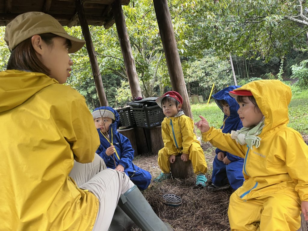 あずまやの中で朝の会。今日の人数は・・・??