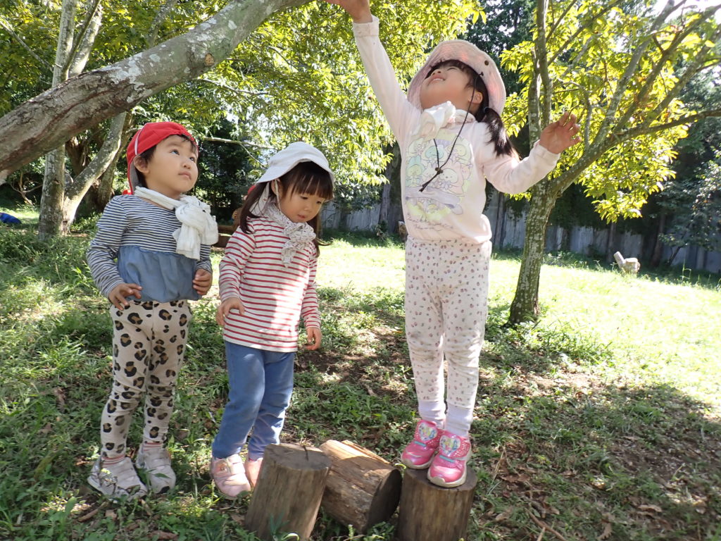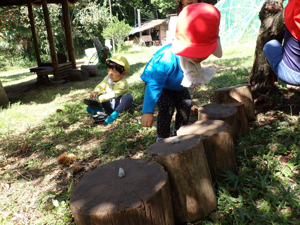 木に登れなかったら、丸太を台にしようと持ってきた子たち。