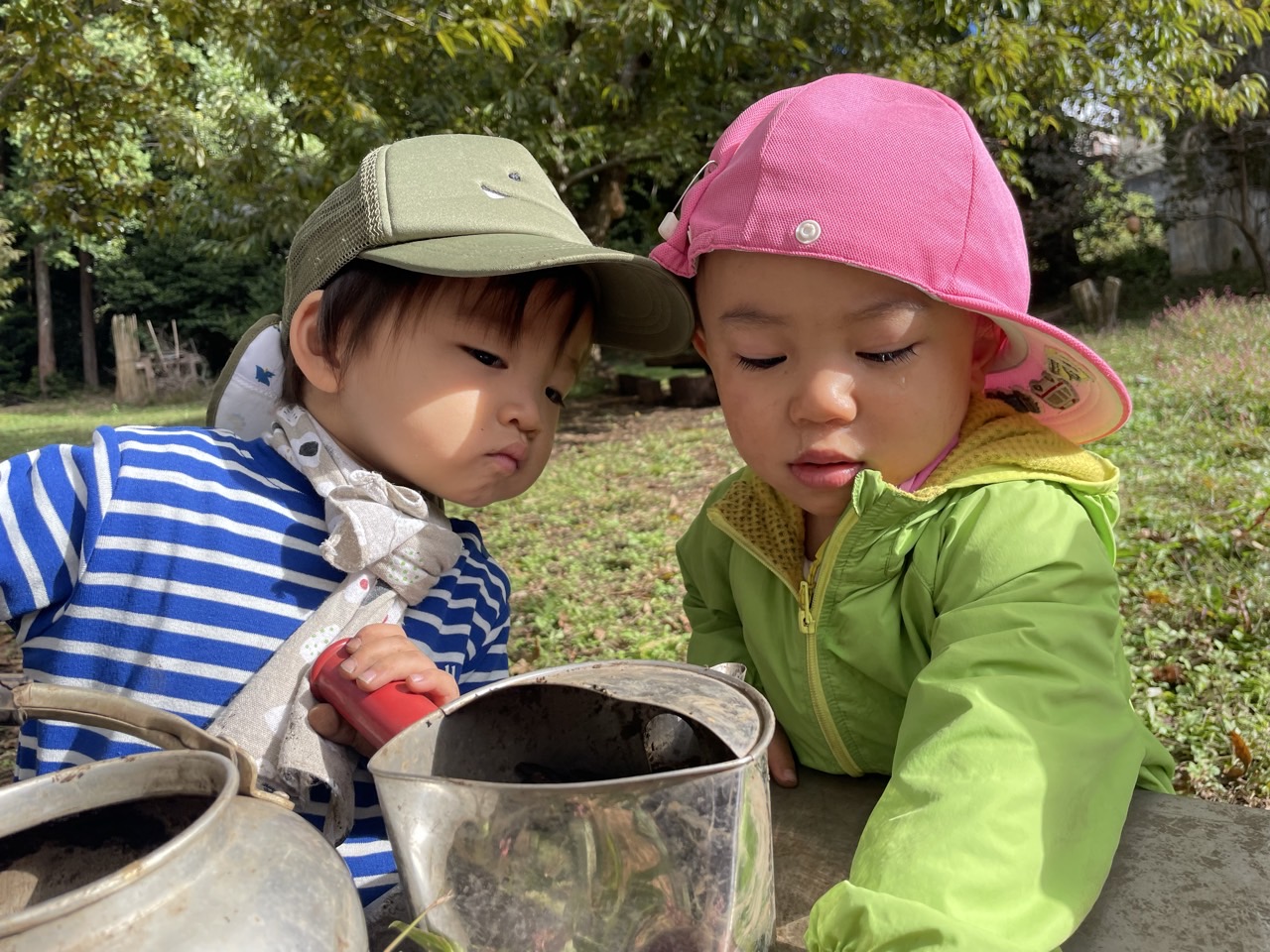 A君とS君がベンチで遊んでいるとA君が水筒を持ってきて