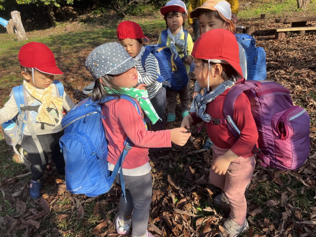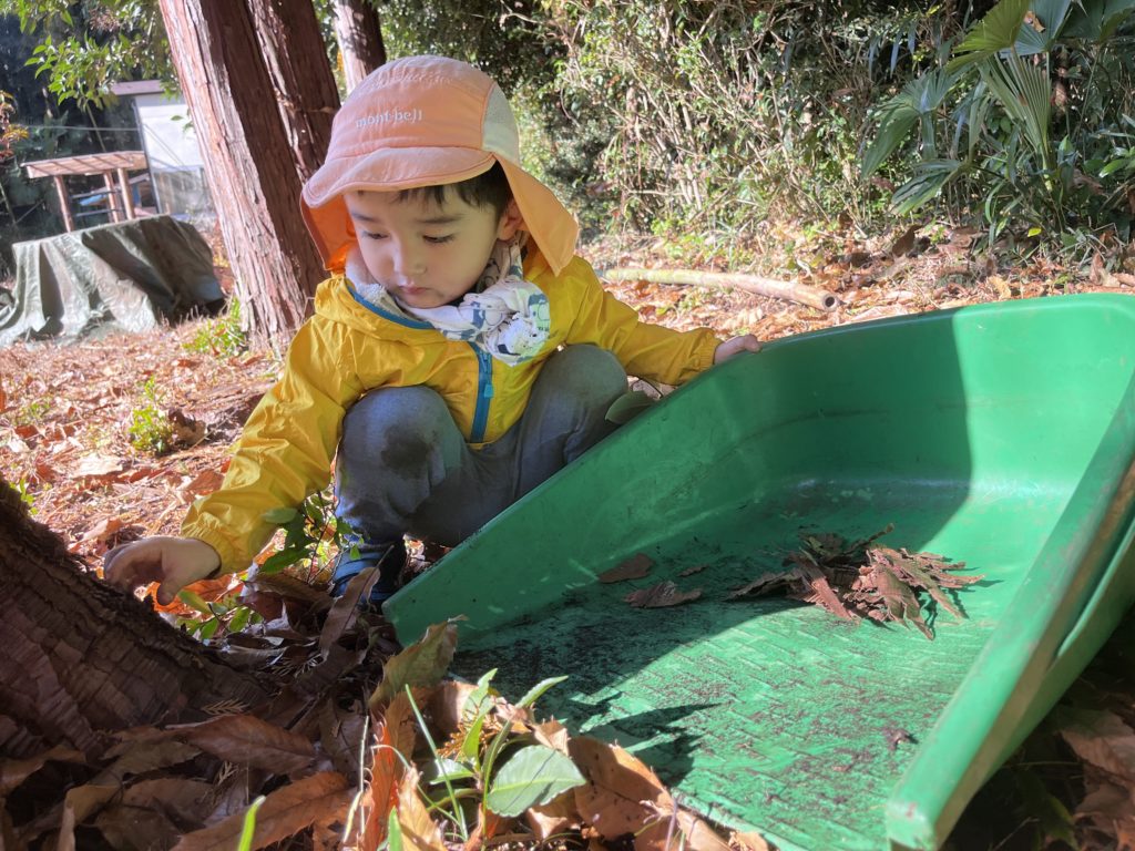 活動が始まると「み」を持って枯葉や木の皮をせっせと集めるYくん。