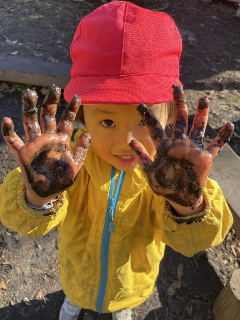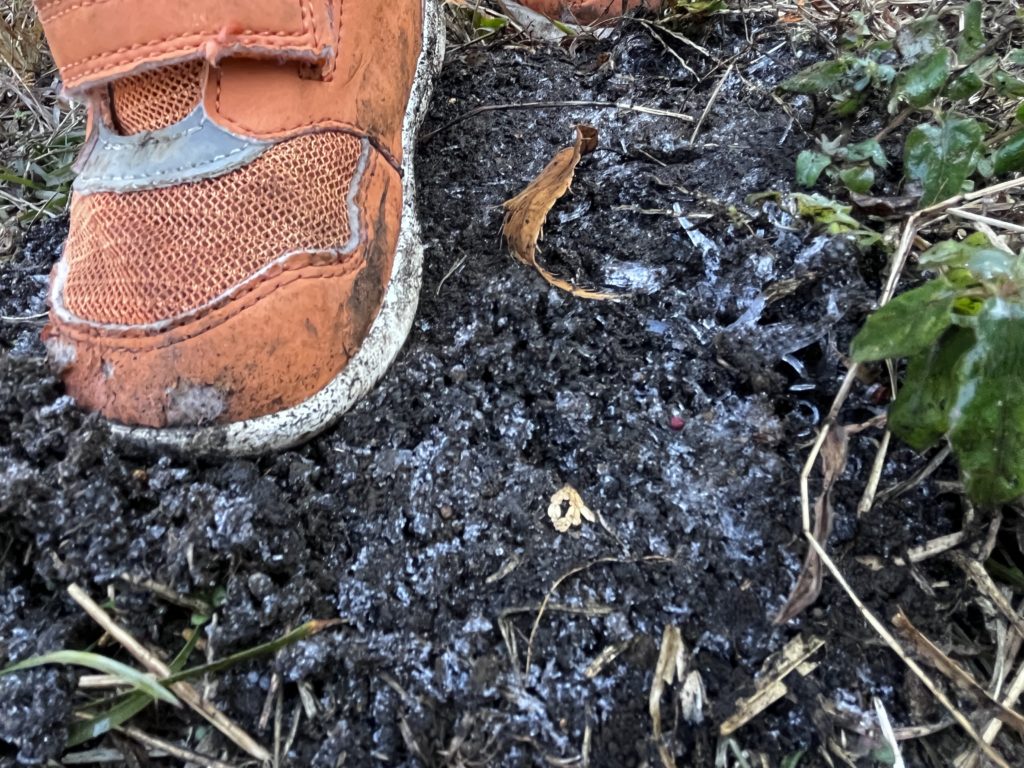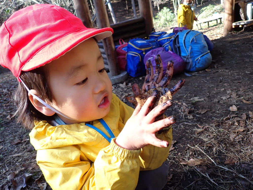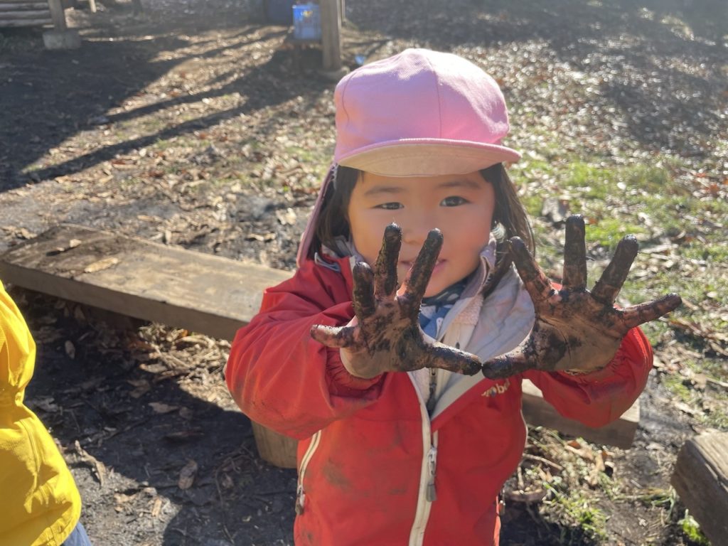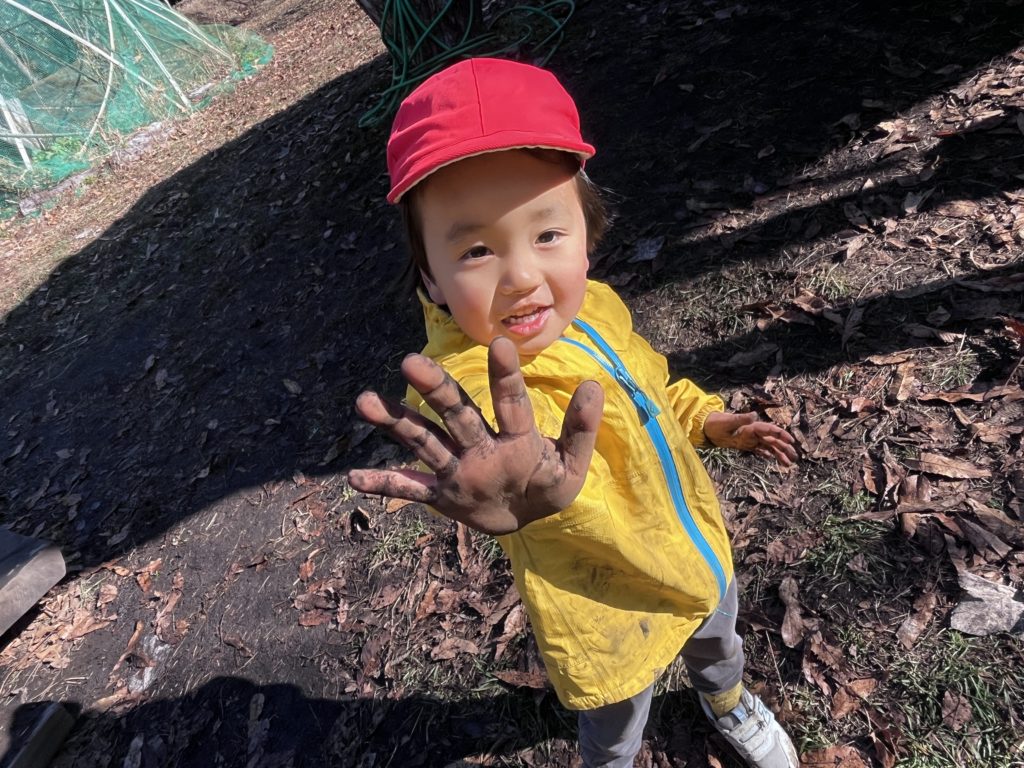 Hくんも、霜柱を触るうちに手のひらが泥だらけに。