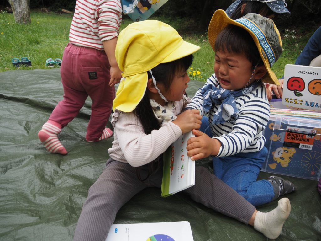 Mちゃんが絵本を勝ち取り、絵本ボックスへお片づけをした。